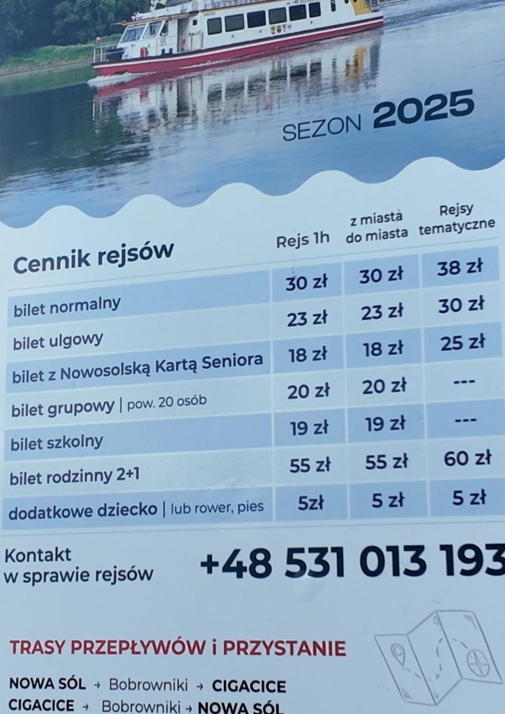 Ceny biletów zależą od typu rejsu (standardowy, tematyczny, rodzinny) i sezonu, przykładowo: bilet normalny ok. 30 zł, ulgowy 23 zł, rodzinny (2+1) ok. 55 zł. Bilety zwykle kupuje się bezpośrednio na pokładzie 15–20 minut przed wypłynięciem, ale w weekendy czy przy wydarzeniach tematycznych warto przyjść wcześniej lub zarezerwować miejsce. Rozkład rejsów i dostępność zależą od pogody i poziomu wody w Odrze, dlatego najlepiej sprawdzić aktualne informacje na oficjalnych kanałach lub zadzwonić przed wizytą.