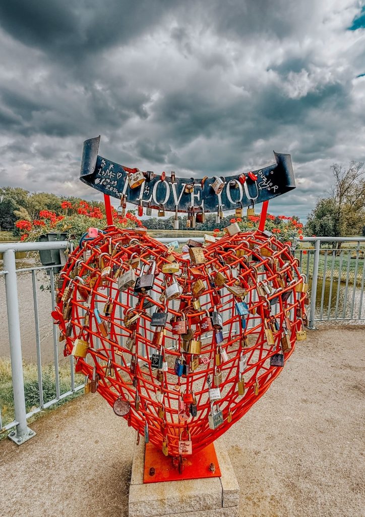 Kilka kroków dalej czeka kolejny, nowszy portowy most w kształcie łuku, który stał się jednym z symboli miasta. To miejsce, gdzie mieszkańcy i turyści zatrzymują się, by zrobić zdjęcie albo po prostu podziwiać widok na rzekę. Na jednym z końców mostu stoi metalowe serce z prętów, na którym zakochani wieszają kłódki to tradycja rodem z Europy Zachodniej, która przyjęła się i tutaj. Małolata oczywiście zawiesiła swoją czerwoną kłódkę z imieniem i datą, co stało się naszą małą rodzinną pamiątką z Nowej Soli. Most prowadzi na drugą stronę portu, gdzie zaczyna się spokojniejsza część miasta, idealna na rodzinny spacer.