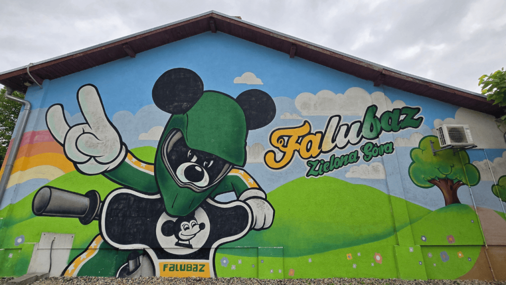 Sam budynek też ma coś ciekawego do pokazania, bo jego ściany zdobią murale: z jednej strony dynamiczny obraz Zielonogórskiego Klubu Żużlowego „Falubaz”, a z drugiej sympatyczna scena z dwoma krasnalami.