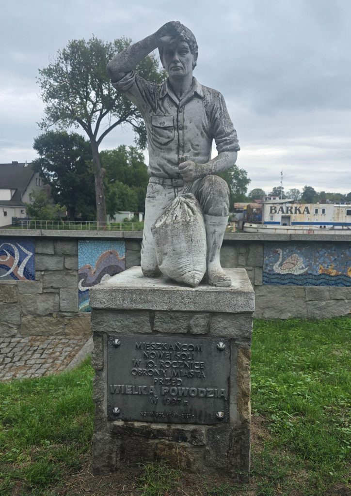 Nieco dalej stoi Pomnik Powodzianina, odsłonięty w 2007 roku w dziesiątą rocznicę wielkiej powodzi. Rzeźba klęczącego mężczyzny z workiem piasku przypomina o wysiłku mieszkańców, którzy wspólnie bronili miasta przed żywiołem, to symbol solidarności, który mocno wyróżnia Nową Sól na tle innych nadodrzańskich miejscowości.