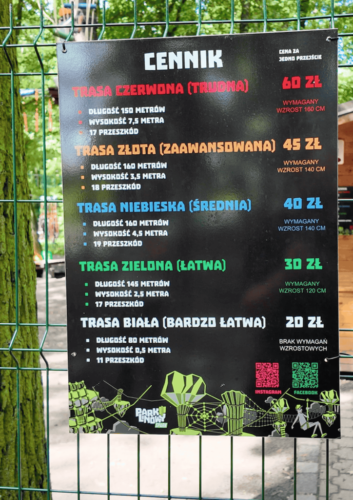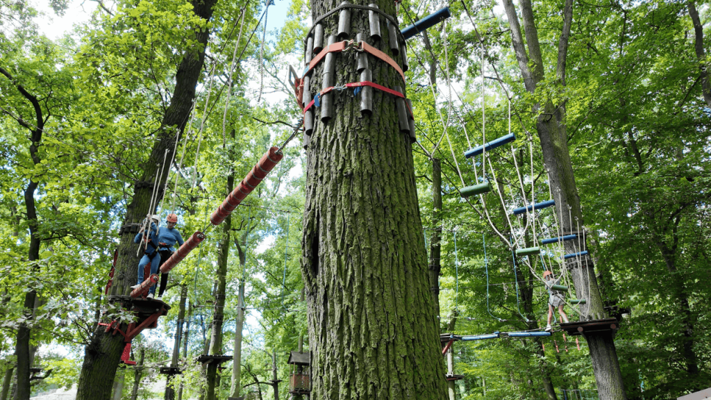 Najwięcej adrenaliny czeka na złotej i czerwonej trasie – wysokość powyżej 5 metrów, wiszące mostki, „truskawki Tarzana” i szybkie zjazdy tyrolkami. To propozycja dla tych, którzy chcą sprawdzić granice swojej odwagi.