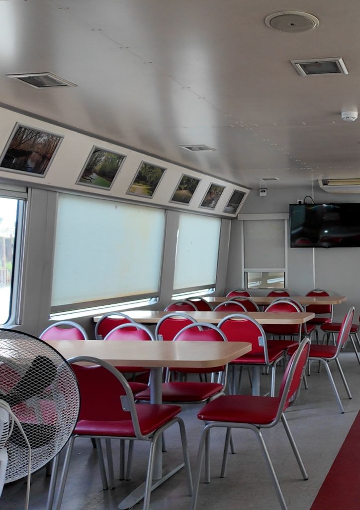 Laguna ma dwa pokłady — górny otwarty z widokami i dolny zadaszony oraz klimatyzowany. Na statku znajdziecie bar z napojami i przekąskami, toalety i udogodnienia dla osób z ograniczoną sprawnością. Dzięki temu rejs jest wygodny nawet z maluchem czy wózkiem.