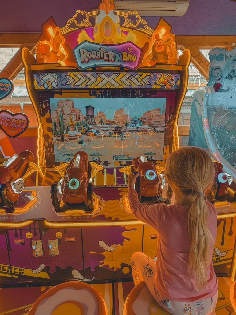A jeśli ktoś potrzebuje chwili przerwy, to zaraz przy placu stoi niewielki budynek, w którym działa mini salon gier, sklepik z zabawkami i drobiazgami oraz lodziarnia-kawiarnia – idealne miejsce na lody czy szybką kawę.