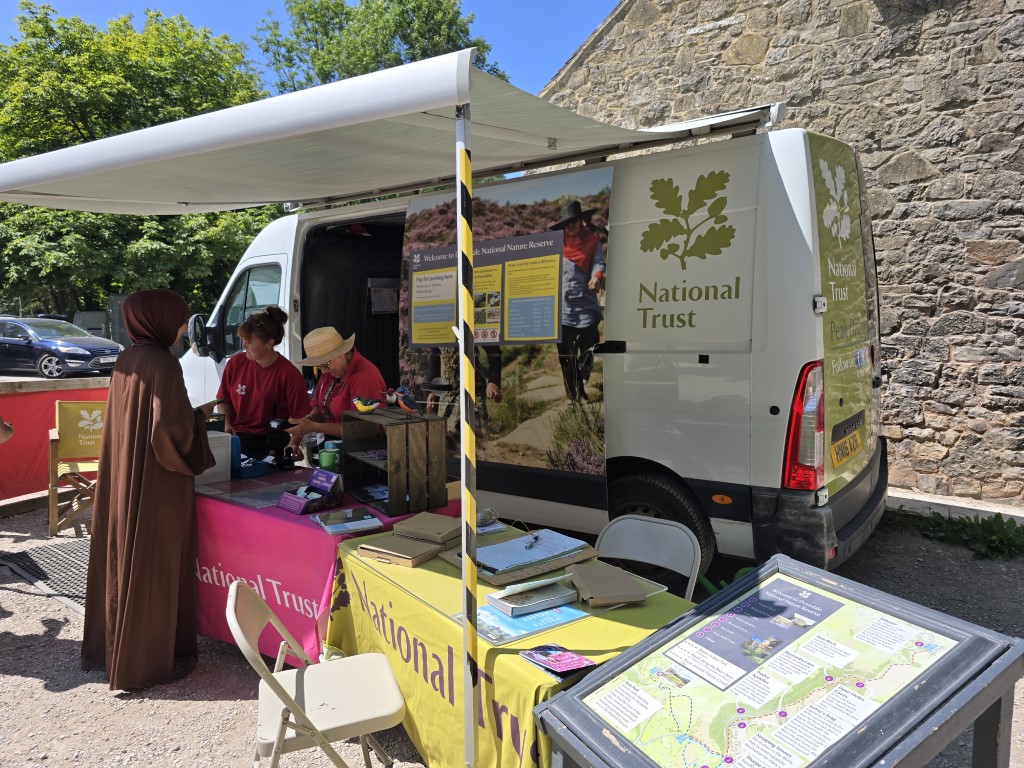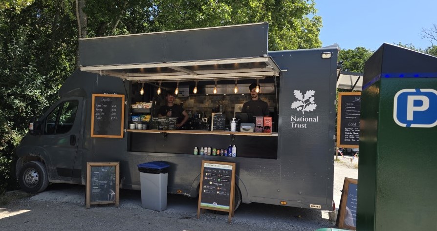 Na szczęście obok, tuż przy wejściu na szlak wzdłuż rzeki, stoją dwa vany National Trust – jeden z przekąskami (napoje, lody, ciepłe i zimne kanapki), a drugi pełni funkcję punktu informacyjnego. Można tam zgarnąć ulotki, porozmawiać z obsługą i – co najważniejsze – zapłacić za parking kartą, bo mają czytnik.
