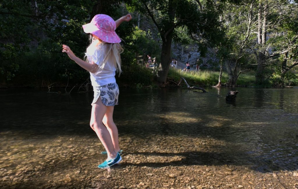 Widzieliśmy mnóstwo ludzi w wodzie, dzieci brodzące, psy taplające się do woli – rzeka jest płytka, ale nurt potrafi być szybki. My pozwoliliśmy Małolacie zamoczyć nogi przy brzegu – głównie po to, żeby się ochłodzić. A przy okazji… była to świetna zabawa.