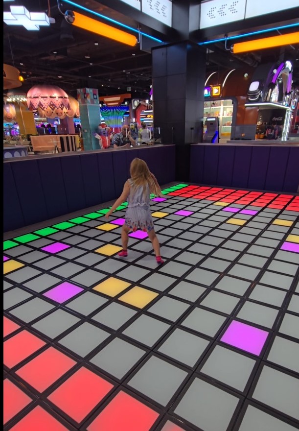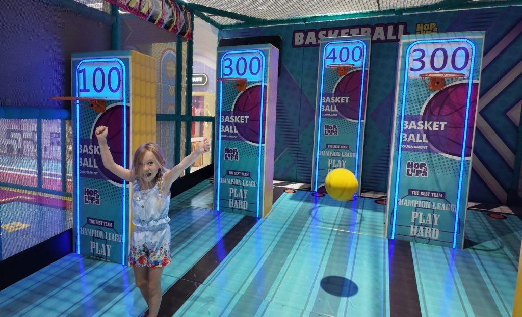 Hopalupa City jest naprawdę rozbudowana. Są tu nie tylko domki, ale też ogromna strefa małpiego gaju, zjeżdżalnie, wielkie miękkie klocki, piłki, koszykówka, boisko do mini piłki nożnej, a nawet podświetlana podłoga, na której Małolata urządziła sobie małą dyskotekę. Co chwilę zmieniała kierunek i biegła do kolejnej atrakcji, bo wszędzie coś się działo. Przez całe dwie godziny, bo tyle trwa standardowa wejściówka, krążyliśmy po strefie, zahaczając o wszystko po trochu.