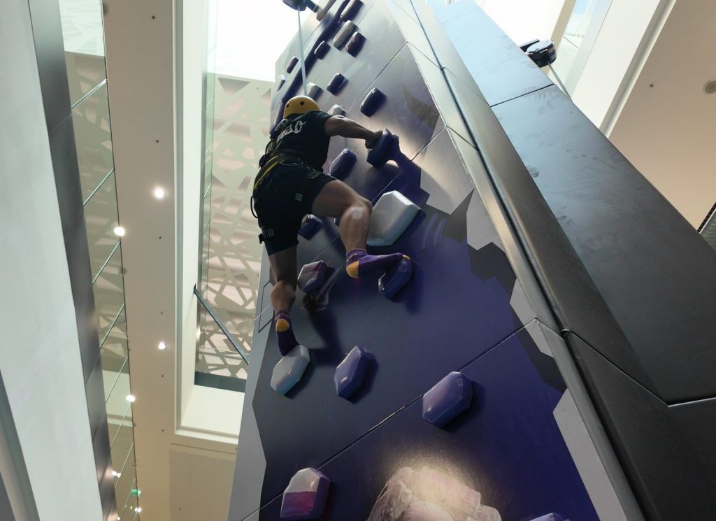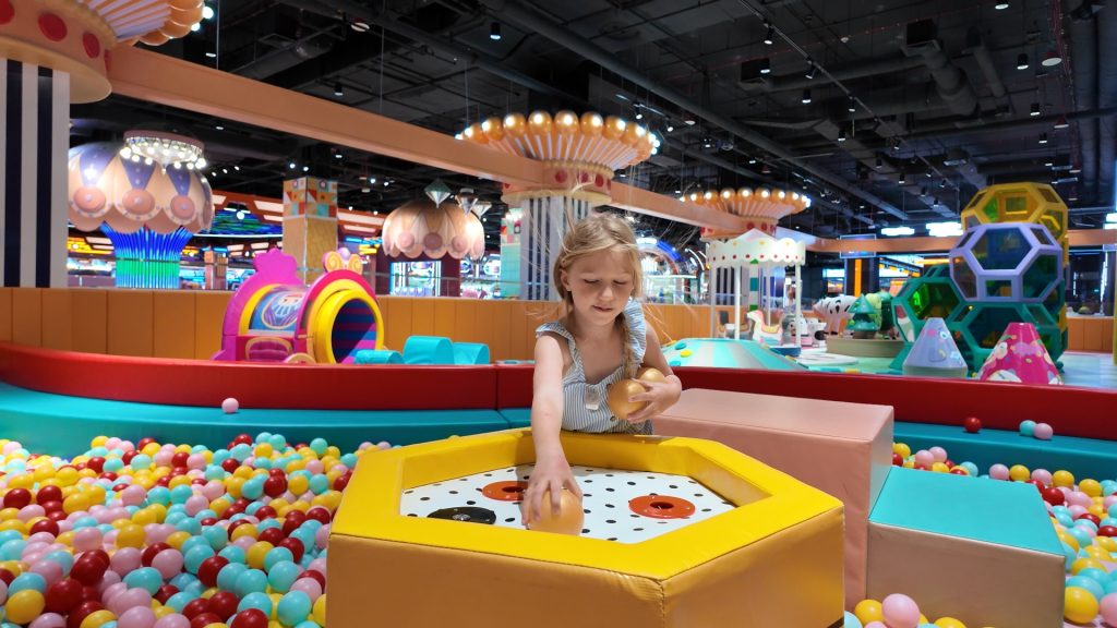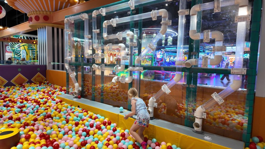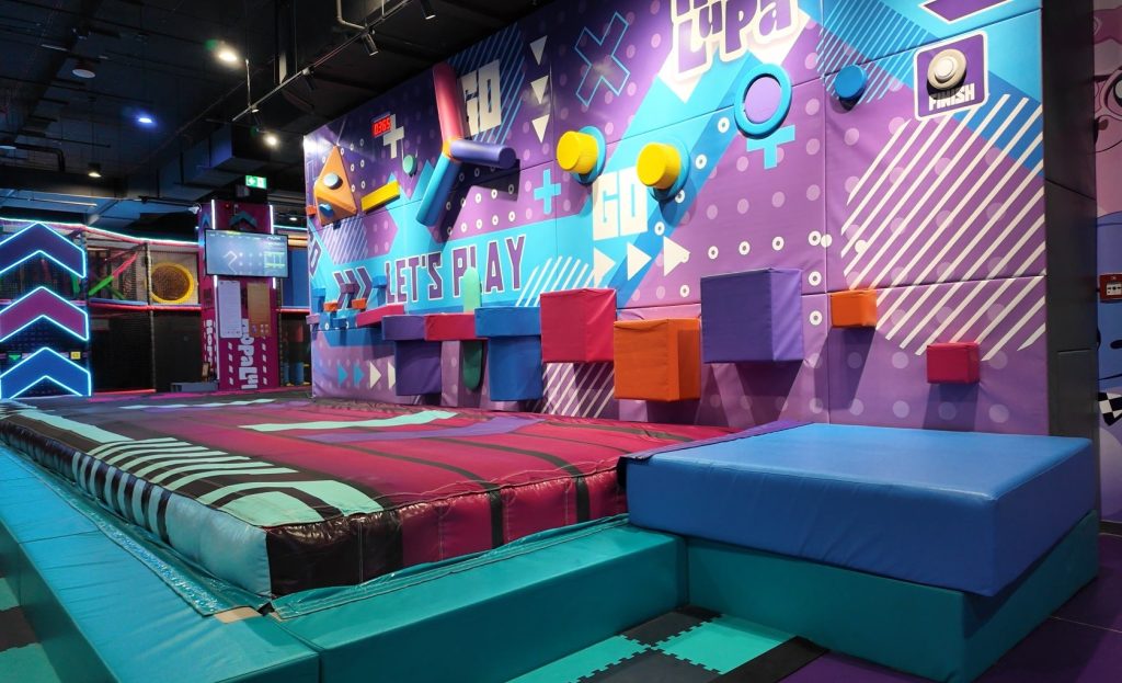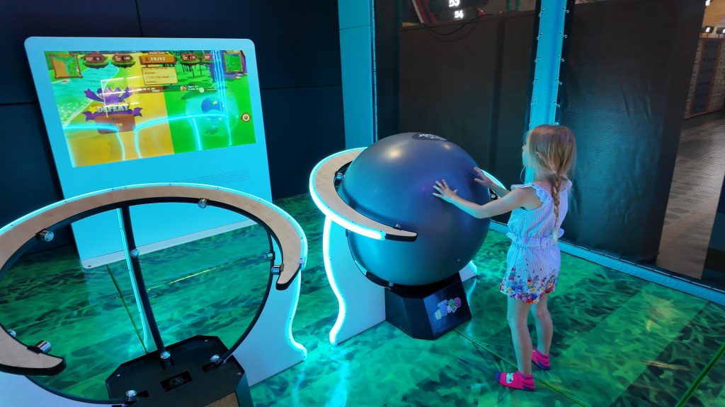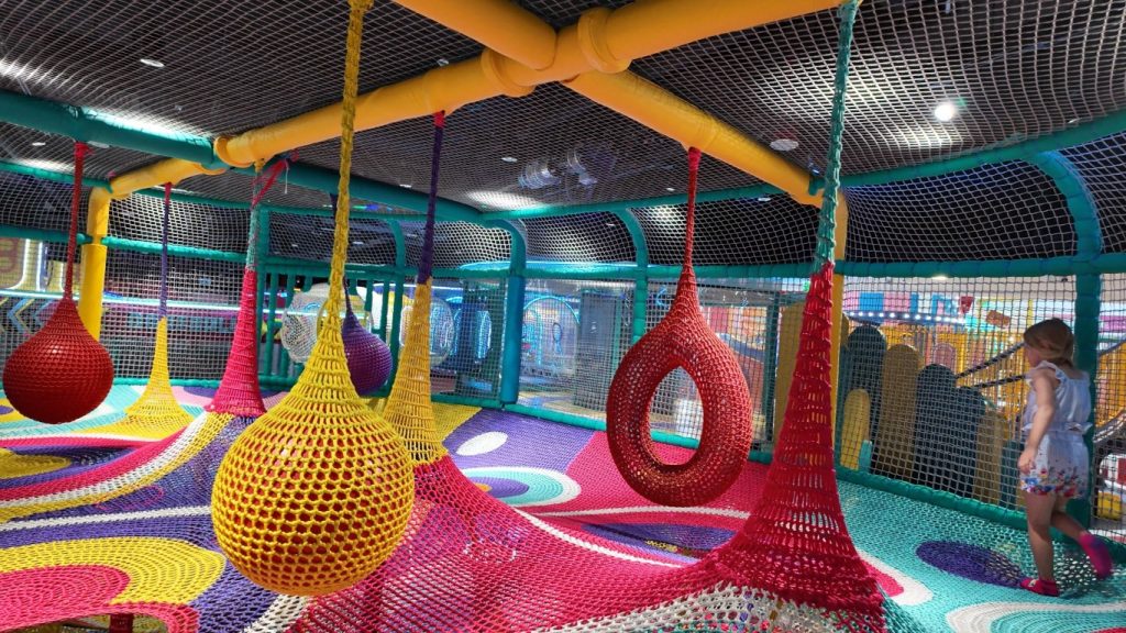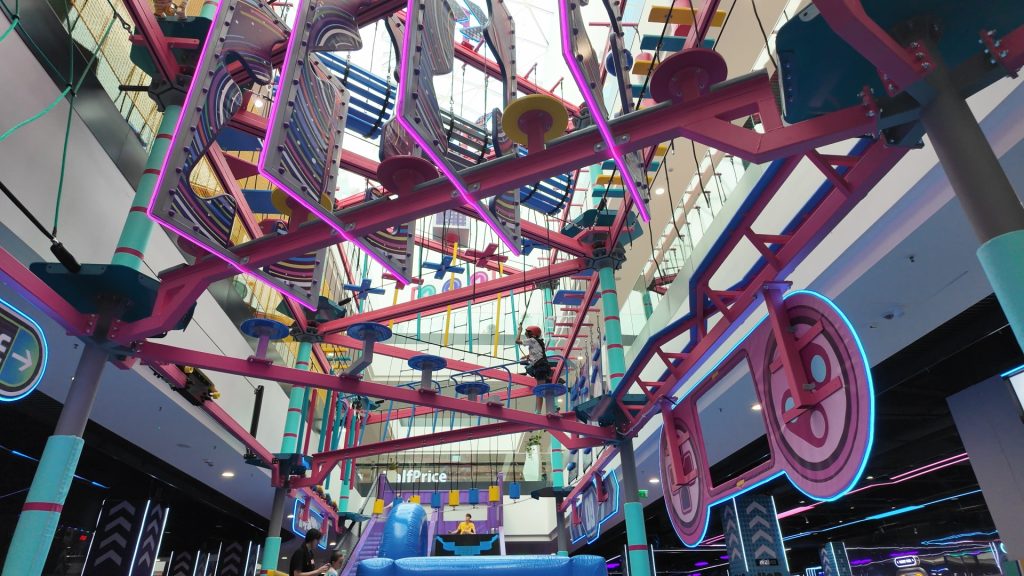 Dla nieco starszych przygotowano ogromną strefę trampolin z basenami z gąbkami, torami przeszkód, parkiem linowym, zbijakiem i specjalnymi poduchami powietrznymi do skoków. Do tych stref warto się zaopatrzyć w skarpetki antypoślizgowe które można na spokojnie kupić na miejscu. To miejsce naprawdę robi wrażenie – nie tylko na dzieciach. Częścią tej strefy jest też ogromna ścianka wspinaczkowa i tor ninja, który potrafi rozłożyć na łopatki niejednego dorosłego.