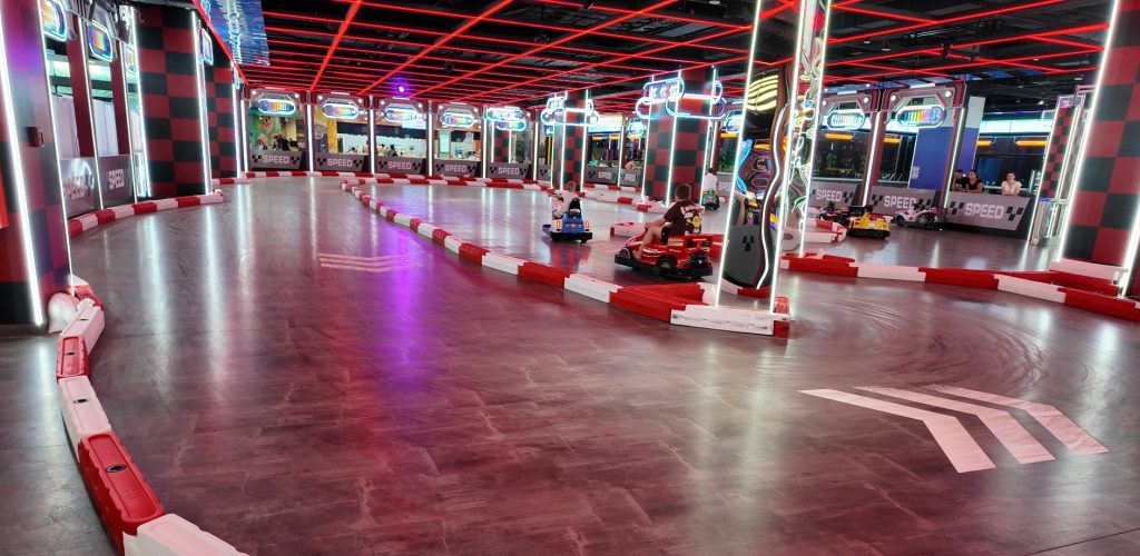 Po wyjściu ze strefy trampolin zrobiliśmy jeszcze rundkę po obiekcie. Zajrzeliśmy do części z gokartami i automatami do gier, naprawdę tego jest tam mnóstwo. Od klasycznych maszyn z łapką, przez zręcznościówki, po coś bardziej nowoczesnego.